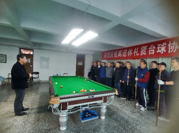 谭业庭代表“礼贤”台球协会,对离退休工作处的大力支持表示感谢,并表示将在离退休工作处的领导下,积极主动做好协会工作,开展丰富多彩的活动,同时希望广大会员积极参加协会活动,遵守规章制度,共同建设好、发展好老年台球协会。